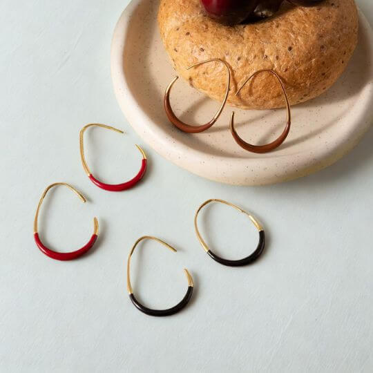 Schlanke Halbcreolen aus 18k vergoldetem Edelstahl mit farbiger Spitze; drei Varianten: Dunkelrot, Braun, Schwarz. Nickelfrei, hautfreundlich und leicht. Modernes, minimalistisches Design, das sowohl zu Casual Looks als auch zu eleganten Outfits passt. Ideal als Everyday-Hoop mit subtiler Farbnote.
